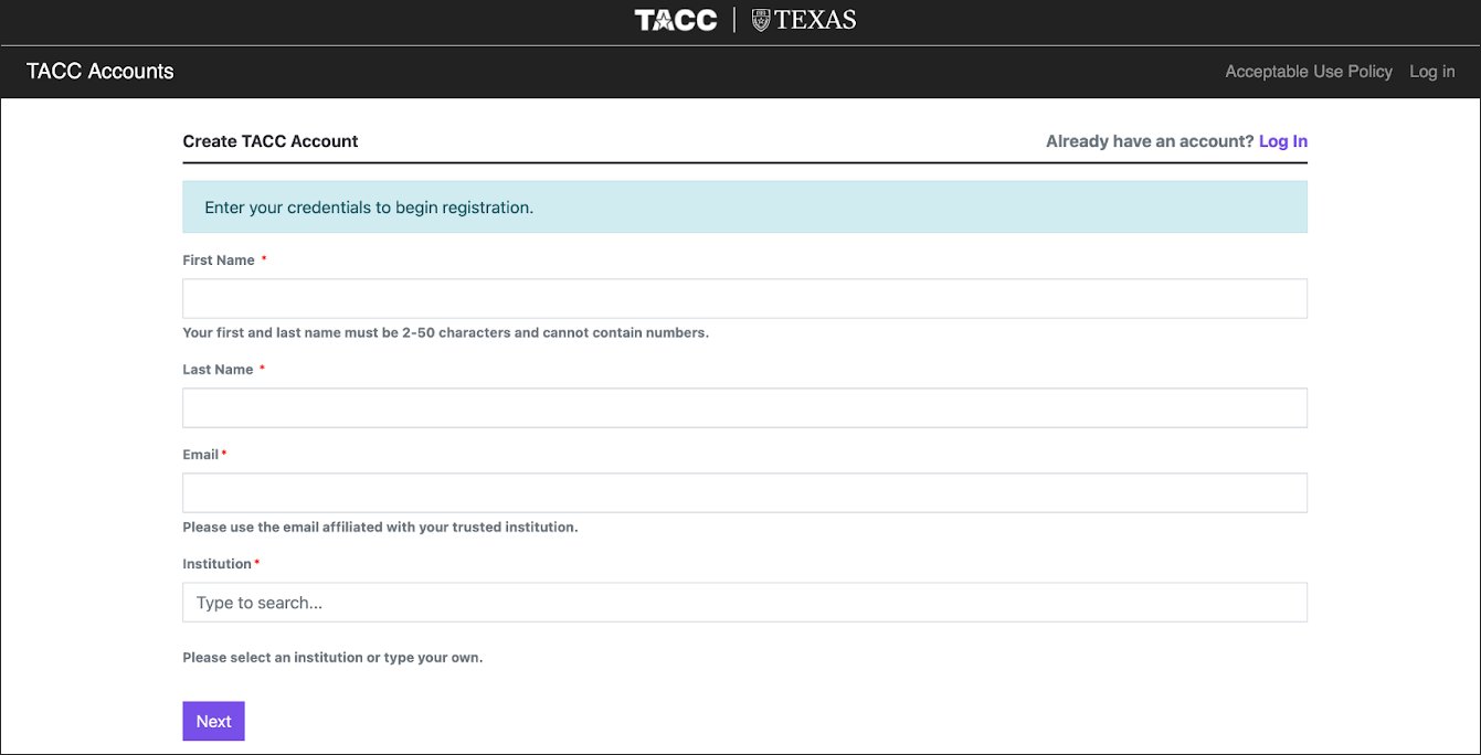 Your request to create a TACC account may take up to 48 hours. For more information about creating a TACC account, visit TACC's Getting Started page.