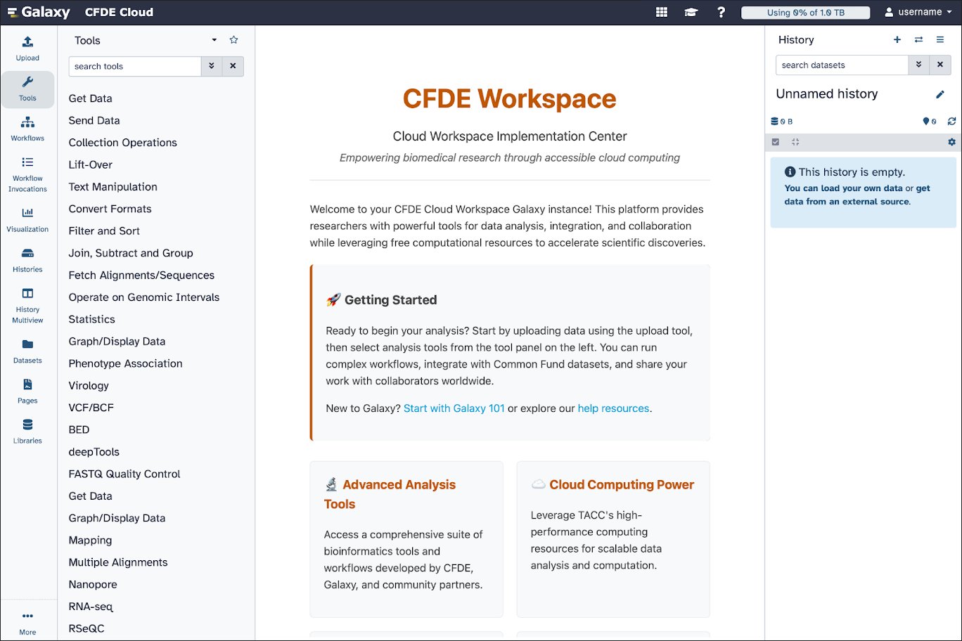 Galaxy is the web-based platform for data analysis the CFDE workspace is run on. When you see tutorials over Galaxy, know that they apply to the CFDE workspace as well.