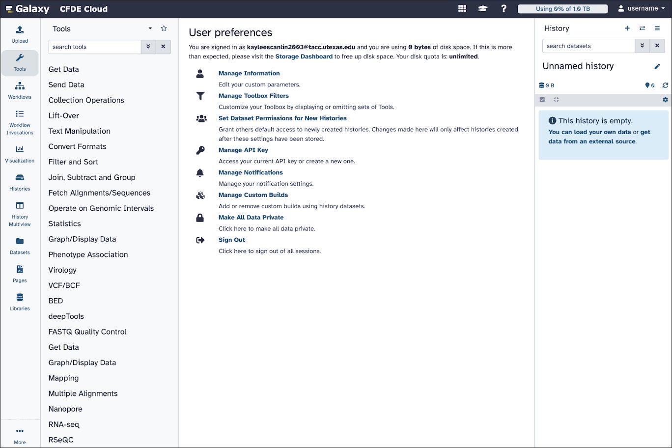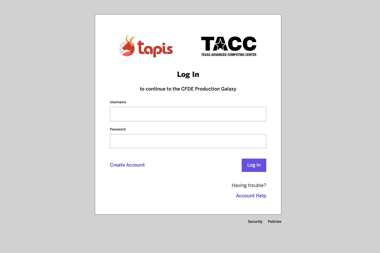 Navigate to the Galaxy CFDE Workspace. Here you should see a log in page. If you have an account with CFDE already, log in using your username and password. If not, click ‘create account’ to create an account with TACC.