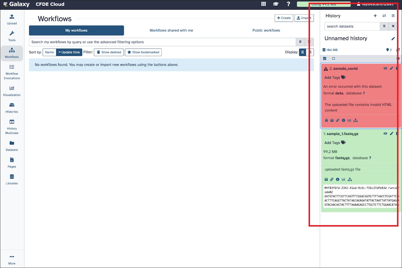 There is a toggle-able history sidebar on the right that will display recent activity in the CFDE galaxy portal, as well as their statuses and any error messages that might pop up.